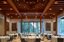 The Social Hall, with its stepped wood ceiling and engineered oak wood floor with the wedge wood inlay, has the view of the river and the park. The social hall is surrounded by glazed panels and wood verandas that provide a very strong relationship of the social functions to the park.