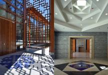 The strong rhythm of the stained silver birch column seen as the ‘Poplar trees’ march into the building with the flanking wall in cut stone with stained pine for roof decking and silver birch for columns, rafters and beams, lead one to the breathtaking, fully glazed grand Foyer which has the view of the Civic Plaza, river and the majestic mountains beyond. On either side of the Foyer, portals lead to the Social Hall and the Contemplation Hall. The floor pattern is embellished with the blue stone whilst the wood columns have an inlay of locally embroidered strips of fabric using local motifs, the wood columns and ceiling create warmth and a welcoming feeling.