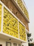 While translating the meanings of many striations and oblique lines, the production of the facade art piece sought local participation in its architectural narrative. From the use of perforated metal sheet, stone work, carpentry, bamboo and cane artistry, landscaping to the wall motifs and two-thirds the brick and mortar work were all locally sourced.
