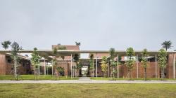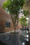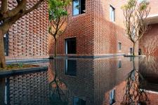 Twelve blocks of building alternating between breezy green gardens are all linked by a large concrete roof system. Horizontal and vertical corridors system creates together a rich interweaving of spatial dimensions and offers many interesting views. The water pond system, which is located in the center of the building, acts as a reflected surface to emphasize the aesthetic of the brick material as well as produces a microclimate and cooling effects for the building. These harmonious design aspects form a unique semi-outdoor space for the occupants to enjoy and interact.