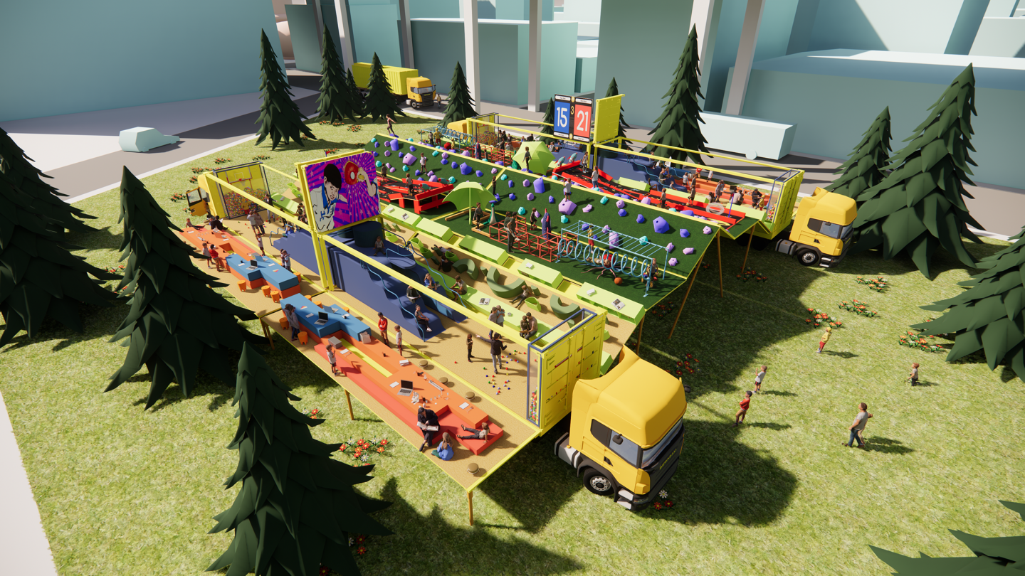 This is temporary classrooms for urban school which make use of cargo trucks. To fold different Specialized classrooms into a cube for a truck to load, the classroom on the wheel is constructed with steel panels like any other containers, yet applying accordion structure as rain shelter when classrooms are "unboxed". Inside the classroom package, each space is composed of dynamic FRP furniture with vivid colors fixed onto each wall panel.