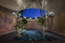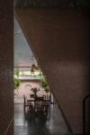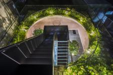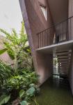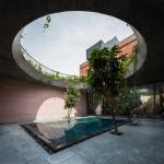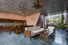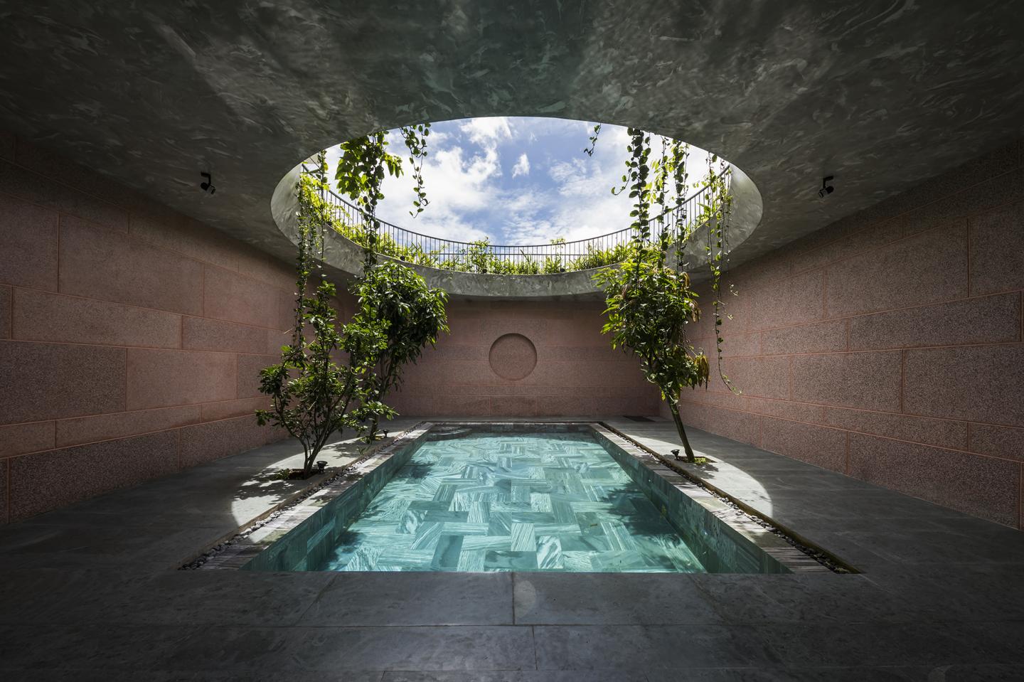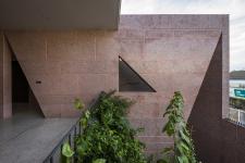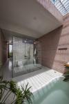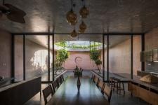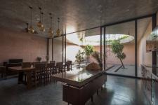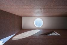 • The space is separated into different layers with a homogeneous wash stone (granito) material inside and outside, blurring the boundaries, only the subject and the atmosphere surrounding the subject form solid. calculation of the space by purpose of use and each activity that takes place. Architecture has a special material relationship with human life, as a cover and foundation for the life that unfolds around it. A large opening with space connecting the sky and the building, has a metaphorical and evocative connotation of the small image of man before the vast nature. Functional spaces are compressed in a solid mass