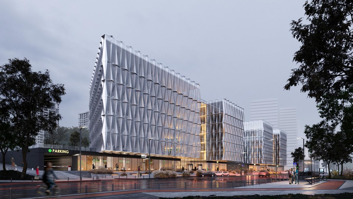 The highly efficient office complex with a lake recreational area, a pedestrian street with public spaces along the facades, and a residential area in the second phase.