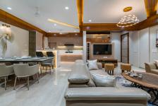 The continuing ceiling pattern in the open layout of drawing, living, and dining, reflects the rhythmic flow of the apartment, making it look spacious.