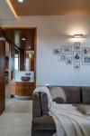 The wooden screen acts as a backdrop to the seating as well as passage to the bedrooms, maintaining partial privacy to both areas.
