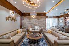 The drawing room is characterized by bespoke furniture in hushed tones. Neutral sofas, patterned rug, and ornate puffies embellished with raw-wood center table are highlighted with brick-patterned wall cladding.