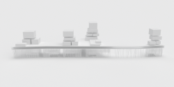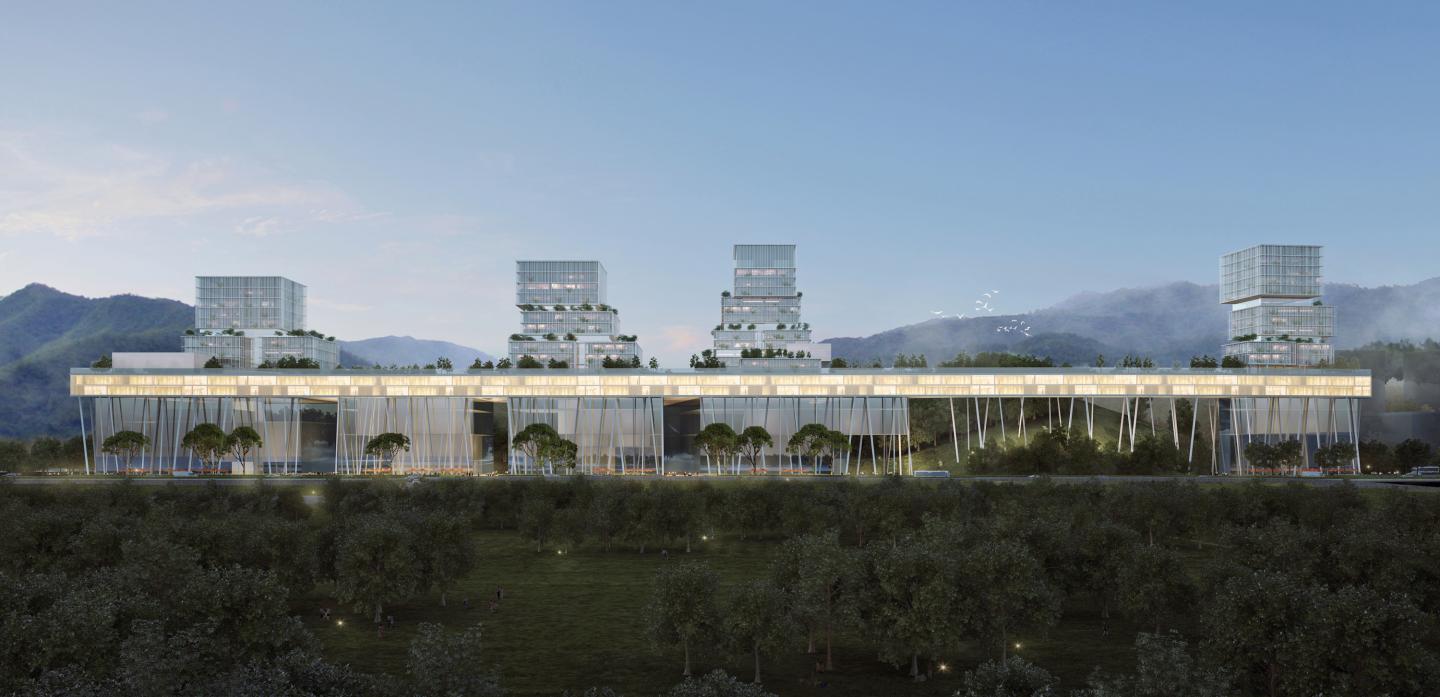 Inspired by the logic of piers, we treated all the fragments as a whole and thus successfully turned the disadvantage into a distinctive experience: a large, suspended platform almost covers all the buildable area. The two-story platform provides surface for green space and sports facilities, and thus becomes an energetic recreation park for the staff. The podiums below the platform are public serving functions. The space between the podiums and slanted poles form a series of required colonnades for pedestrians. Loosely piled on the platform, towers are broken into smaller blocks, providing spaces for internal use.
