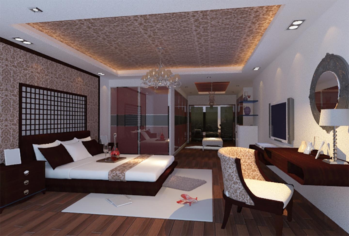 Classic bedrooms have a special visual appeal and special shapes are used in them. Classic decoration may seem like an old style to some, but many people also choose classic decoration for their home. This style does not have the flexibility and adaptability that modern architecture shows and this is one of the main features of the classic style. Wallpaper is usually used to work on the walls. Beautiful wallpapers give the room a different effect. You can use wallpaper for all the walls of the room or use a wall to paint the wallpaper to show the focal point of the room. Bedroom walls are usually painted with wallpaper and decorated with plaster. From the wallpaper we can also mention small patterns and ordinary flowers. In general, it can be said that the walls in the classic style should not look empty. In the classic style bedroom, the location of the bed is such that it does not face the door; That is, if it is half open in the bed, it is not visible at all. It is also better to choose your bedroom privately and avoid placing a lot of appliances in it. Classic style involves the use of large mirrors that expand the view in the room. Ceiling design in the bedroom Classic style is usually such that the flat surface is used and in its design, light colors are used, the most popular color is white. . You can also make murals on the ceiling that tell classic stories. In the design of the ceiling, plaster and foam decor are used, and the paintings on the roof in this style give it a bold look. In this project, we used wallpaper on the ceiling, and the purpose of this story was to coordinate the ceiling and the wall of the complex. This project is designed for a middle-aged couple and due to the lack of interest of the employer in the full-wall mirror of the bathroom, it has become a mirrored glass that helps to enlarge the space while reflecting the light. This master bedroom has an area of 32 square meters