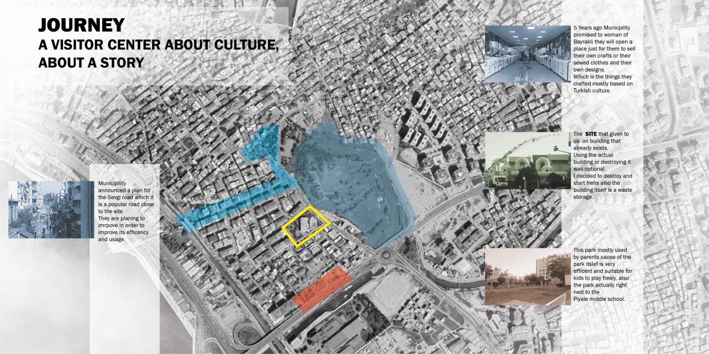 Each culture, consist with stories. However those stories, didn't appeared in a second. Those stories appeared in adventures, in journeys. Without movement there would be no action. Therefore, A Visitor Center would be perfect for a tell a story, introduce a CULTURE. In the located site there is an archeological site which is Smyrna, you probably going to think this project is focused on history but no. Choosing the Smyrna would be too easy and it would not connect to the neighborhood, the people living in there. Therefore we researched the site more detailed and we found a small bazaar. Which this bazaar is for Women of Bayraklı. They creates their own crafts like sewing clothes or toys, even small trinkets which designed around Turkish Culture and sell those items in that Bazaar, and this is actually a promise from Bayraklı Municplity to give women financial freedom. With that we found our goal, we wanted to promote this action and design a place which will work as a exhibition area around women role in Turkish Culture and put workshops to give education to Turlish women to improve themselfe and promote their financial freedom. Therefore we added one more item to our program list, gift shop or a bazaar.
