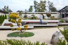 landscape with very special thematic terraces- a Chinese Garden with a Dragon Tail, a Japanese Rock Garden with Torii Gate 尉と姥, a Birch Grove with Cobalt- blue Puzzle and Mediterranean Line, where the Red Vine Infinity Pool is Located.
