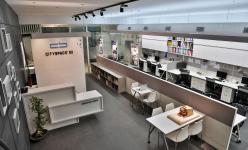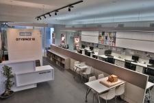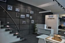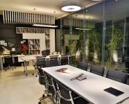 The office is partially divided into two segments, where the left and right sides serve as visiting and working areas, respectively. The visitors' side is accentuated with track lights to confer upon a winsome appeal. Two discussion tables are also provided alongside the reception area, also used for vendor interactions.