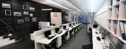 All the services are kept exposed. The white painted air conditioning duct forms to be a perfect fit for the overall look and feel of the office space. The furniture and material palette picked out are also specified to be black and white. The all-white ceiling gives the office a spirit of vastness and immensity. The flooring also follows the same primary colour scheme.