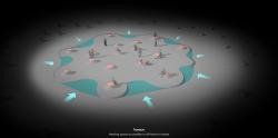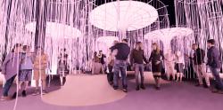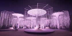 The project proposes a model of public space colourful to the image of the population of the place where it is located. Beyond the very colourful aspect typical of the regions of the world marked by a great social mix, we wanted the place to be alive both day and night without causing energy waste. A convivial space was created in the basement, separated from the ambient noise. Skylights bring in natural light and the reflection of the water creates a fantastic environment that changes throughout the day depending on the lighting. Above, mushroom-shaped structures mounted on a platform accessible to all carry cables covered with bioluminescent paint. During the day, the cable drill filters and captures solar radiation and produces a poetic effect. You can walk under this canopy and enjoy the show. You can also sit, lean back, ... or read, listen to music, talk, ...