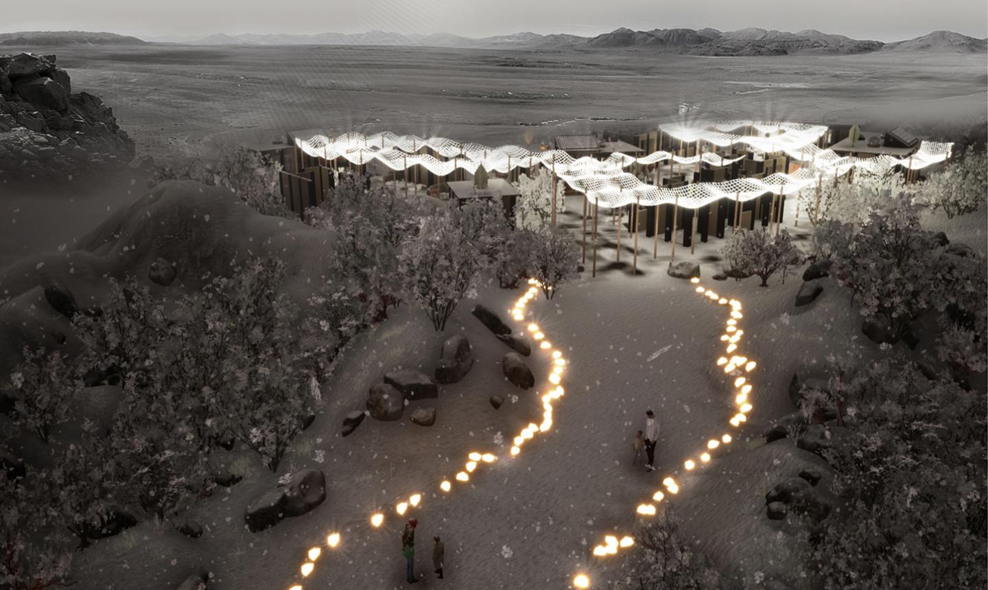 Fiber optics has the ability to receive and transmit light from one side to the other. The use of optical fibers in the ceiling and walls of the design provides the opportunity to transmit light into the building and provide a bright space for users.