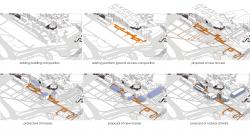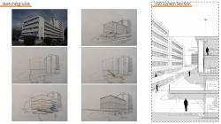 SGK blocks form a wall in the site. It restricts the access of two important streets (Milli Kütüphane Street and Cumhuriyet Street) on the ground floor. The idea is that the area is evacuated and open to the public, and the circulation of the two streets is strengthened.