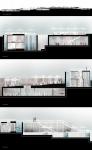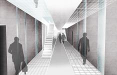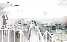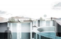The main circulation corridor divides the composition into two unequal parts and runs axially along its entire length. There are three zones - corridors, the central one is at the same level as the water surface of each pool and refers mainly to the visitors of the project. On the contrary, the other two side corridors are mainly aimed at serving the tenants and follow the level of the bottom of each pool. These two corridors are then connected to the semi-cylindrical, private aisles of the apartments.