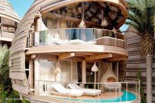 These high villas-nests offer to the guests a natural landscape integrated into the project, community pools surrounded by nature, magical outdoors spaces with sun beds areas, as well as a lounge bar/gym/yoga/spa areas and a beach club.