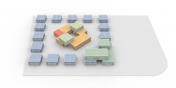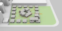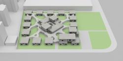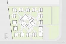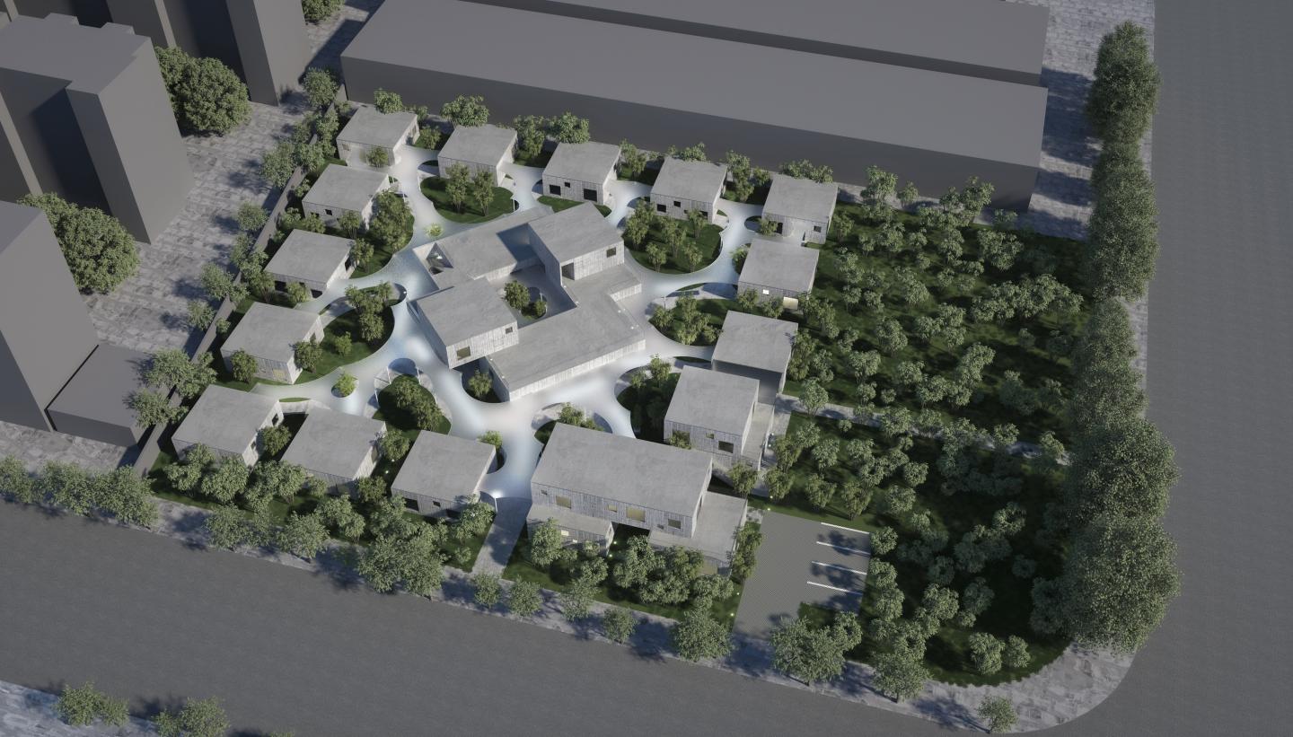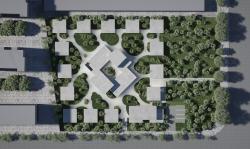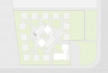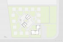 We rejected the conventional model of integrated building volumes and uncomfortable gardens. Instead, all of the private rooms for elderly people are separated into small independent concrete volumes with abundant natural light and dispersed to the perimeter of the site, while all the public space (dining, entertainment, library, medical room, .etc) and serving facilities are placed in the center. With all the mechanical rooms in the basement and staff rooms on the 2nd floor, there is no need for the elderly habitants to leave the ground floor.