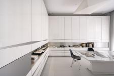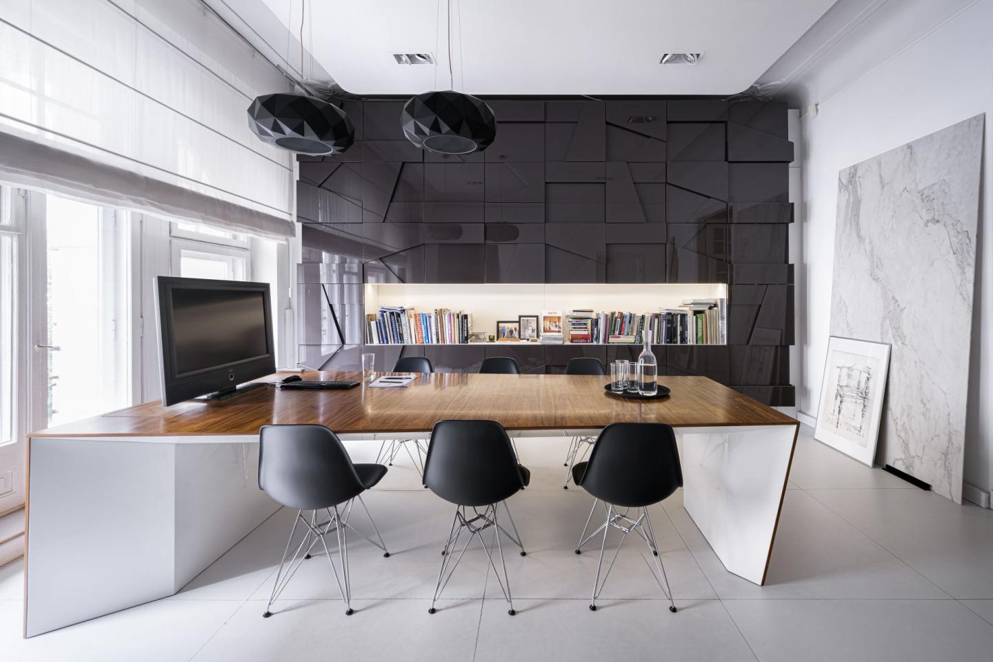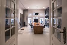 The colour scheme is composed of monochromatic grey, black and white, which are sometimes breached subtly with warm wood. In this way, into a historical context of the building from the beginning of the 20th century, a modern, functional and fit for the 21st century office was integrated. Apart from a workplace for a design team, there is also a spacious conference room which serves as place for meeting clients. In the next room, which is adapted as a showroom, there are presented carefully selected finishing materials, samples, project prototypes, fabrics and also pieces of art to the clients.