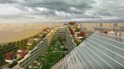 The green roof has en environmental role saving energy, combating the urban heat island effect, reducing stormwater runoff, providing a natural habitat for urban wilderness, filtering pollutants and absorbing carbon dioxide out of the air. The roof gardens reduce organic waste by producing compost, reuse rainwater for irrigation, and produce food with top roof urban farms. The roof-park also produces renewable energy with a top canopy made of solar panels.