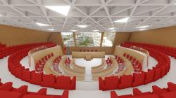 The new Municipality Building of Tirana is the first zero-emissions building of Albania and aims to serve as a new model for sustainable developments and as a new symbol for an open, transparent, and accessible municipal administration. It is formed by two intertwined volumes, articulated around a central public space, that generate a hybrid landscape inspired by the nature of Tirana province. This hybrid landscape is formed by the following elements: