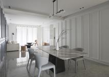 The building of the residence is based on the premise of maximizing the white space, so as to avoid the European-style lines from overly affecting the relaxing atmosphere of the residence. Taking advantage of the original architectural plan, the design team connected the living room and dining room to each other, making its use area open and flexible. The gray-tone wall serves as an embellishment of the public area, which clarifies the functionality of the space. The plain white and quiet gray and white tones give the space a rich layering, cool and elegant, creating a simple and relaxing atmosphere. Wall panels with hidden doors are the details of the project. The use of hidden doors allows neatness to replace fragments, and at the same time solves unnecessary space waste, makes the entire living environment more tidy, and creates a clean life experience.