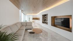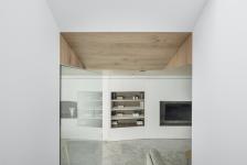 This defines, on the ground floor, a setting for a living room, kitchen and dining room, longitudinal and translucent, which allows part of the spaces to open to the patio. Around these, an “equipped partition” unfolds, housing storage space and integrating kitchen furnishings, at the back, without losing the continuity of the lines, a matt white design that softens the forms and eliminates corners. Perforated in this, as geometric spaces in stone (polished, shiny brown marble) are the holes for the hob, shelves, TV etc. Behind the kitchen, a bathroom is hidden thanks to the turn in the furnishings. The flooring, in white marble, continues into the patio, creating continuity throughout this level. The patio brings light to the living space and produces reflections in the marble.
