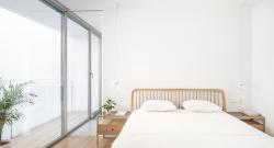 Above this the first floor is in the shape of an L. Here the main bedroom opens onto the patio, materialising in an interior balcony, while the second bedroom and the study open onto the street. As with the ground floor, the interior flooring of the bedrooms, (in this case of wood) continues towards the exterior onto the balconies. The façade has a powerful presence and large openings in this shorten the linearity of the front.