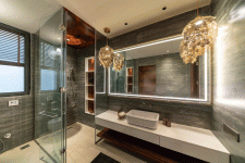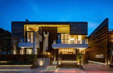 To maintain a very close relationship with the natural forces, the approach for the design was to keep it as earthy as possible. It is a meditative abode for a spiritual user experience. Calmness, serenity, and climatic influences have top priority along with the aesthetics. The exterior façade has drawn inspiration from the rocky landscape and the snow-capped mountains of the upper Himalayas, the place from where the cliental is originally from. For separating the formal and informal spaces in the house, there is the smart placement of the lift and staircase, keeping the floor plan open. The kitchen is of a practical design keeping in mind the Indian cooking methods. To ensure continuity, cladding from the exterior continues inside as well. Alongside maintaining a natural vibe, the luxurious experience defines the spacing and various elements like the mirror doubling into a television screen, etc.