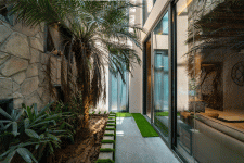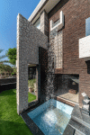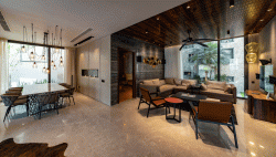 Clients, the Vashisht family hailing from the mountains of Himachal Pradesh, had a very balanced design requirement. An abode, that is modern enough in its aesthetics but at the same time possess a powerful inclination towards nature and its effectiveness. Thus, to give the necessary ambiance, the abode has different elements starting from the iconic falling waters to every possible stone finish for the cladding, providing a natural waterfall house experience. To observe spirituality in the house, Vastu Shastra is been taken into consideration while planning the spaces. The planning consists of enough service areas, well-segregated accessibility, which not only ensures the privacy of the family members but also, ease of the house help. The expectation of it to be closely related to nature came with a motive for all the residents to have their senses engaged and active with it. The architect strategically designs the landscape courts keeping in mind the requirement of large indoor space for the joint family. Though they seem quite hideous in comparison to the common lounges, the need for appropriate cross ventilation and daylight is fulfilled.