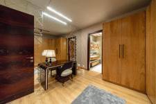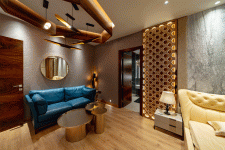 The color palette consists of darker colors and to complement it there is ambient lighting for soothing the eyes. The onyx finished wardrobes, the carpeted floors, and the spacious washrooms add to the luxurious experience for the user. There are personalized elements in the house. The prayer room is clad with a custom-made Radha-Krishan wallpaper making us feels like we are right in Vrindavan. The overall look of the house is justified by using various textured materials relating to the nature-inspired look, starting from Om Namah Shivay at the main entrance to the Cow’s figure in 3-D Stone symbolizing religious sanctity near the interior door.