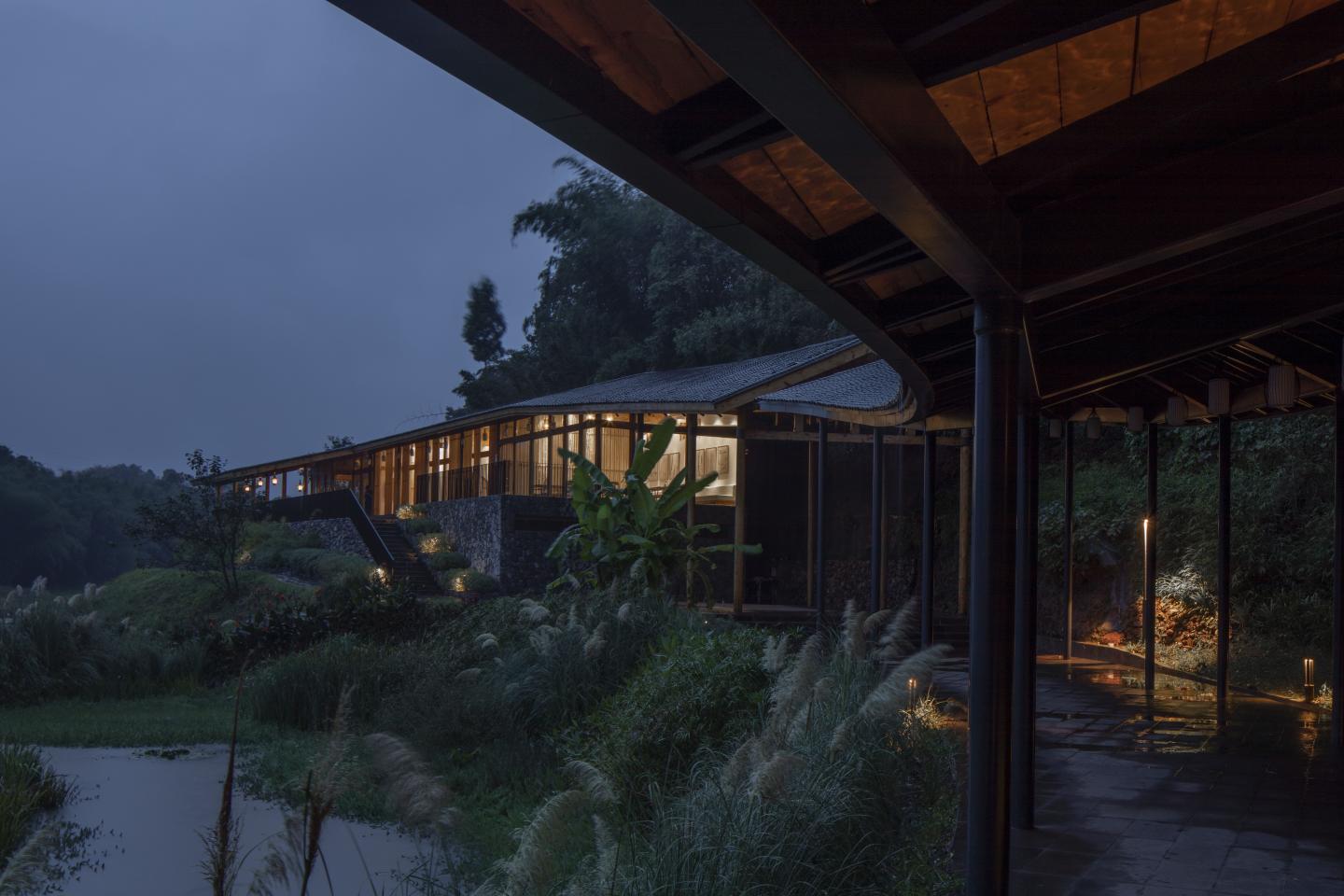 Taking the surrounding hilly skyline as a reference, the buildings fluctuate with the trend and integrate with the bamboo forest scenes.