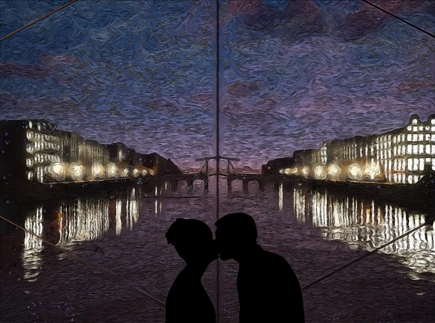 The filter inside the frame is a see-through glass, molded to recreate Gogh’s painting technique and behind this filter is Amsterdam itself. When light passes through it gets broken in such a way that it creates the visual effect of Van Gogh’s style. So whatever is at the opposite side of the frame from your position gets “painted” The Bridge creates a 24/7 painting of live Amsterdam and its people.