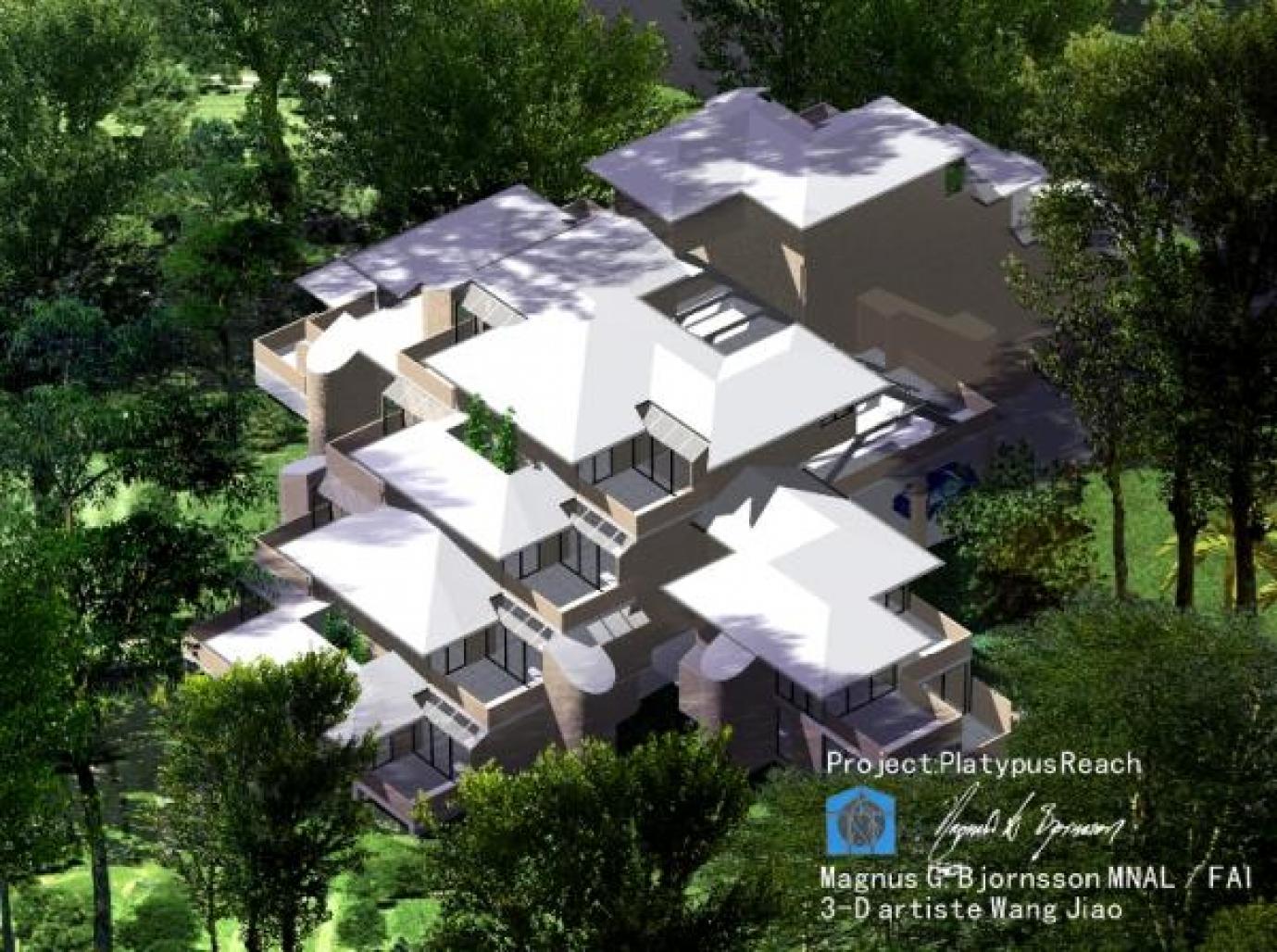 This proposed development is located in the koala corridor in Cornubia in Brisbane`s South where diminishing habitat has made the species vulnerable. It was proposed as an alternative to a conventionally planned 9 lot development, each lot at 600 m² with associated roads. This aproach would strip the site of trees. The site was wooded with approximately 20 metre high eucalyptus “koala-trees” which have now disappeared as the traditional approach was adopted by the developer. The decision was not made for economic reasons, as this development would have been cheaper than the traditional approach, but for fear that stacked houses would not sell as well as conventional detached houses.