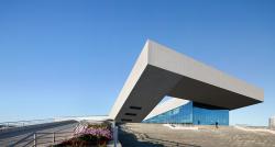 The data network control center took the design concept of “an ark floating on the wavy dunes of the Gobi Desert”, in a dynamic geometric form that symbolizes a ship’s bow rising from tides. The concept is articulated through a set of modern design languages. The entrance space framed by a 30m cantilevered steel structure and horizontal steps creates an imposing spatial experience. Its bold figure reshapes the skyline of the Karamay oil field’s administrative area.