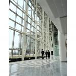 This curved glass encloses a narrow atrium just 4.5 m wide that runs along the administrative spine. The glass design allows the facade to reduce glare and direct sunlight into the office spaces, at the same time providing a climate controlled and cheerful atrium for circulation, pre function interaction, cafeteria and informal spaces.