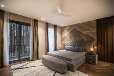 The second and final floor consists of bedrooms. The first bedroom talked about has brown as the dominant color - with marble walls and a wooden floor along with side tables and table lamps make the room look very chic. A pop of color in slight yellow and light grey can be seen in the rug. The crowning glory of the room is the bed, with a tufted headboard and a footboard to make the room look bigger than it already is. Touches of color in navy blue are present in terms of the bedspread and the pillows. The other room on the second floor has a pre-French revolution vintage vibe to it that makes it look mind-blowing. A color palette of creams and sandy browns are present in the room, with a mounted TV opposite the bed, and an ornate table in front of the bed to give it another dimension to the room. Lastly, a sleigh-shaped bed frame adds that extra oomph to the bedroom.