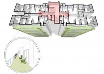 The garden area is placed in the six feet passage in front of the kitchen wall. Stepping stones are used to allow for movement, while the soft patch is deep enough to house small plants like green chilli, mint etc.The concrete slab is layered with drain boards, polymer decks and geofabric mesh to retain soil, while draining out excess water.This transforms the green zone into a kitchen garden filled with variegated aromas. The idea was to augment situations that would complement individual spaces. Similarly, the water feature with wooden deck adds a lightness and serenity to the verandahs, that coupled with a barbeque area invites regular participation and collection.The orientation also maintains penetration of light and proper ventilation in each room, while the balcony remains shaded during summers to regulate indoor temperature and the entire housing block is marked by temperature and air regulation from one passive design feature. The housing block is composed of four such units around a core. They define a longer axis with two terrace gardens facing opposite sides. Thus, the facade of Lumbini reveals unique spatial conditions, lifestyle and activities of each family to produce add a human scale at a macro level.