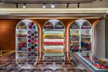 From the consoles to the treatment of the walls, there is subtle continuity in the design language throughout this space that softens and elevates the textile-retail store.
