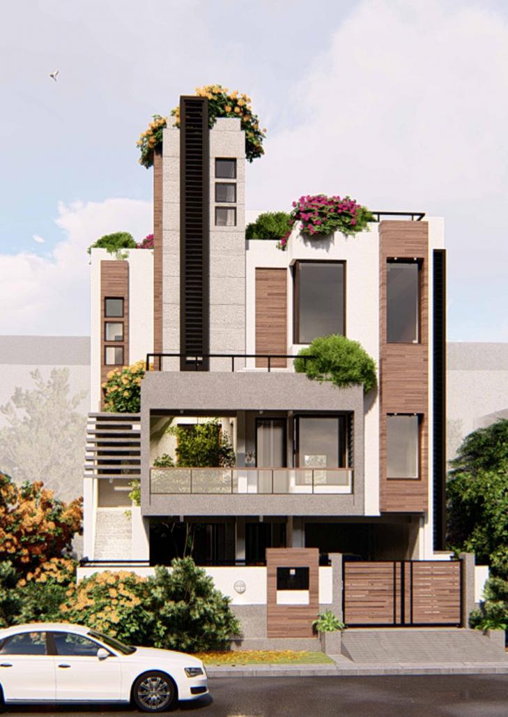 Staggering of volumes also provided the overall structure to have many open-outdoor spaces at various heights and levels. These levels were used to create built-in planters at many places while also as landscape terraces. The staggering further allowed many smaller spaces to be formed in the front part of the house thus providing a very distinctive style and an interesting character to the overall form. As the neightbouring plots share the side walls with the house, the staggering also allowed for breaks with the adjoning buildings. This allowed the volumes and material finishes to bend thus creating a perceptive depth to the exterior elevation design.