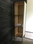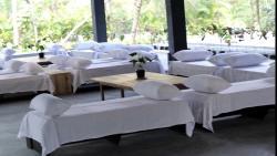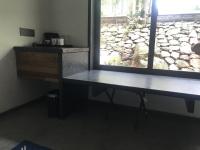 Design – This block has been designed with a huge reception, a small cafeteria and a lounge space interspersed with gravel paved pathways and lined with tropical plants. The rooms are simple and functional and also luxurious. It provides the guests all the essential amenities that would be required. The spaces within the rooms are done up modestly with a palate of steel grey granite, cement finished grey flooring, and slate stone with a built in platform for a cot opening out to a balcony overlooking the landscaped area and hillocks. Each room has a bath and toilet space with granite slabs as partitions along with frosted glass doors. The wash area is separated from the sleeping area by a dark grey slate stone which acts as the headboard for the built in cot on the other side. The steel grey granite along the window acts as a sitting ledge opening out to a view of garden and hillocks outside, which serves as a place to sit and contemplate or get immersed in a book. The raised granite platform with a drawer is used for holding the tea kettle and other accessories. The balcony opening from the rooms looking into the scenic greenery and the pyramid in the distance, facilitates introspection in the meditator.