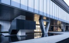 In terms of building materials, the main wall is made of 13mm thick imitation aloes fine sand ceramic plate, 3mm wood-grain aluminum plate, 8+1.52PVB+8Low-E+12Ar+8mm laminated toughened hollow ultra-white glass, 3mm thick fluorocarbon sprayed dark gray aluminum veneer. Locally embellished 3mm thick fluorocarbon spray carbon black aluminum veneer and 3mm thick silver imitation brushed stainless steel aluminum veneer.