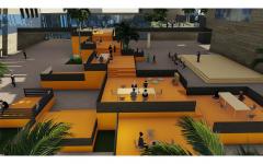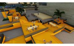 The open space is including a special structure which gradually gets up to have an interesting seating for youths to think, collaborate, and get inspired. It is overlooking a multi functional hall for different activities. The orange color used because it is a motivating and encouraging color that appeals to young people. Moreover, the wide stair leading to the library containing seats and steps to set, and holding small shelfs for reading magazines in the fresh air. The upper open space is offering an interesting outdoor cinema serviced by a small café.