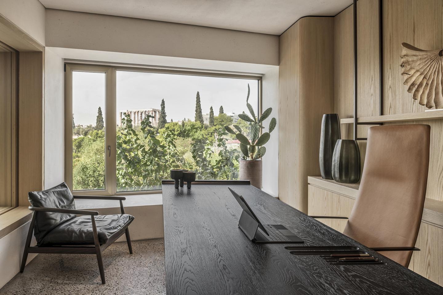 The studio had been on the hunt for a new home to suit both its ethos and growing numbers. The search led the team to the Mets neighbourhood and a late 1960s Athenian polykatoikia (the country’s prevalent apartment block typology, which often mixes commercial and residential uses). Offering a sizeable interior, large windows and mesmerising, long views towards nearby greenery and the city’s iconic ancient ruins, such as the Temple of Olympian Zeus and the Acropolis, a unit on the first floor proved the perfect fit.