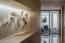 Materials and colours – speckled grey terrazzo floors, light coloured timber, and off-white walls and marble - form a gentle, calming composition. At the same time, a range of textures adds richness, warmth and tactility. Oak surfaces enhance the overall sense of softness and natural feel, which elevates this interior from a simple, ‘neutral’ background to a richly layered and soothing envelope for daily life.