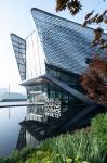 The exterior of the main building is designed with unique forms and materials. Sitting on top of the hill, the three-storey glass volume is wrapped with a lightweight, screened façade. The screened façade is comprised of angled and perforated metal plates to capture and reflect light, creating a sense of wave-like movement. These plates are attached to the main structure through a lightweight steel skeletal framework that helps frame views and balances a sense of openness versus privacy.