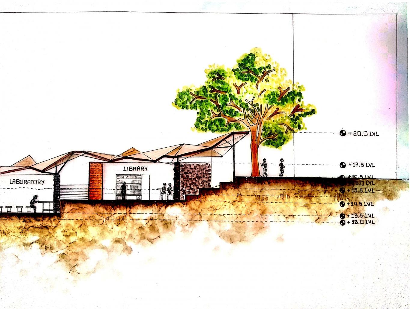 A school is designed at Jaspur Fort on the banks of River Mahi in Vadodara ( Gujarat ). This design is done in a Contextual studio, where context is the main element on the site and the given site is highly undulating with counters. As it was on the bank of the river, many water valleys are passed throughout the site. The total difference between the ground level and the top level is around 16 meters.