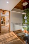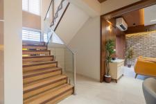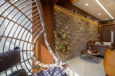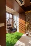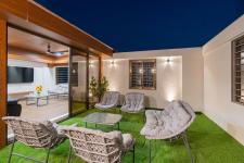 The open-to-sky terrace garden adorned with plants and comfy furniture, is perfect space to unwind and mingle with friends and family over weekends. A covered terrace attached to this open terrace garden acts as an entertainment room.