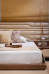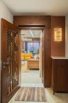 Wood plays a starring role here, with an entire wall clad in veneer finish panelling. In master-bedroom, one can see a beautiful example of how to seamlessly blend doors within the bedroom.