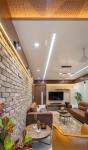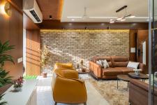 Colour palette infuses vitality in the drawing room, creating an earthy-raw backdrop for times of togetherness. Brownish leather faux sofa are paired with mustard fancy chairs and wooden elements to create a room that’s upbeat and comfortable at the same point.